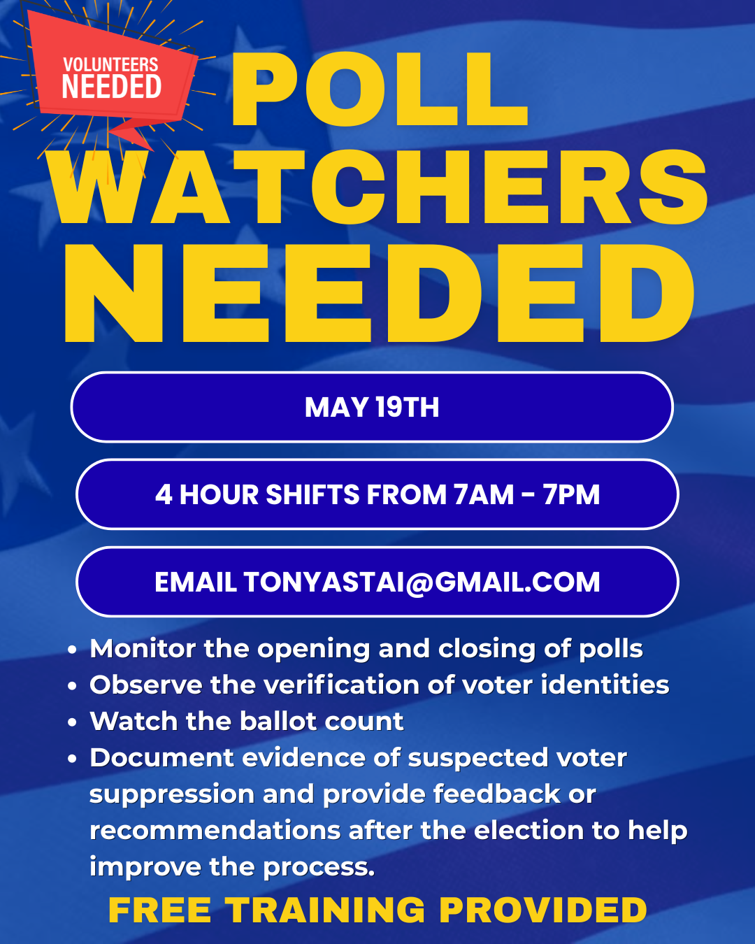 The upcoming elections are rapidly approaching and we need volunteers to be Poll Watchers. Our county has a lot of poll locations, and each location has 3 shifts on election day. Which means, WE NEED A LOT OF VOLUNTEERS! If interested, please email Tonya Stai at TonyaStai@gmail.com