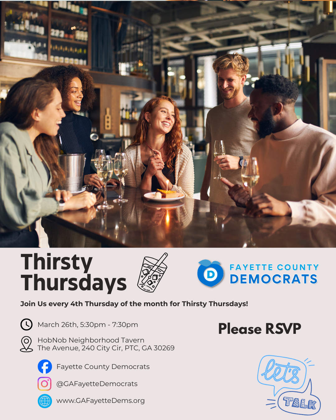 Join us for Thirsty Thursday on March 26 from 5:30–7:30 PM at HobNob Neighborhood Tavern in Peachtree City!